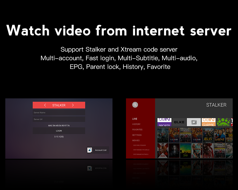| TV APP | Xtream code, Stalker, Netflix(1080P), YouTube(4K), KODI(XBMC), Plex etc. | |