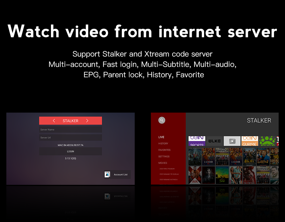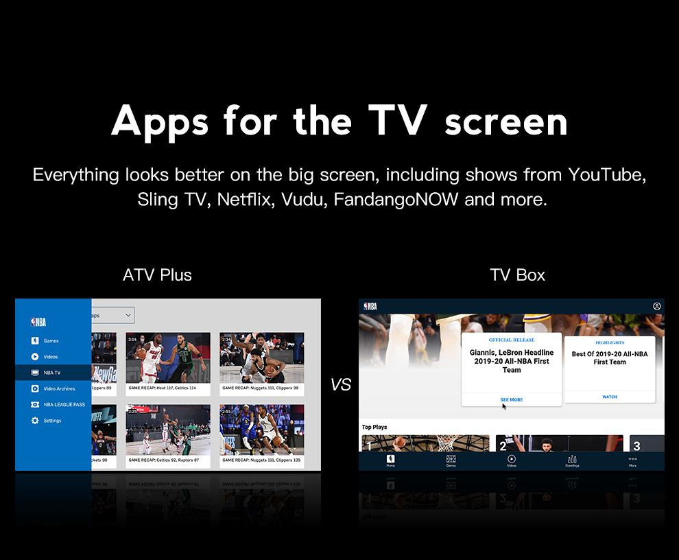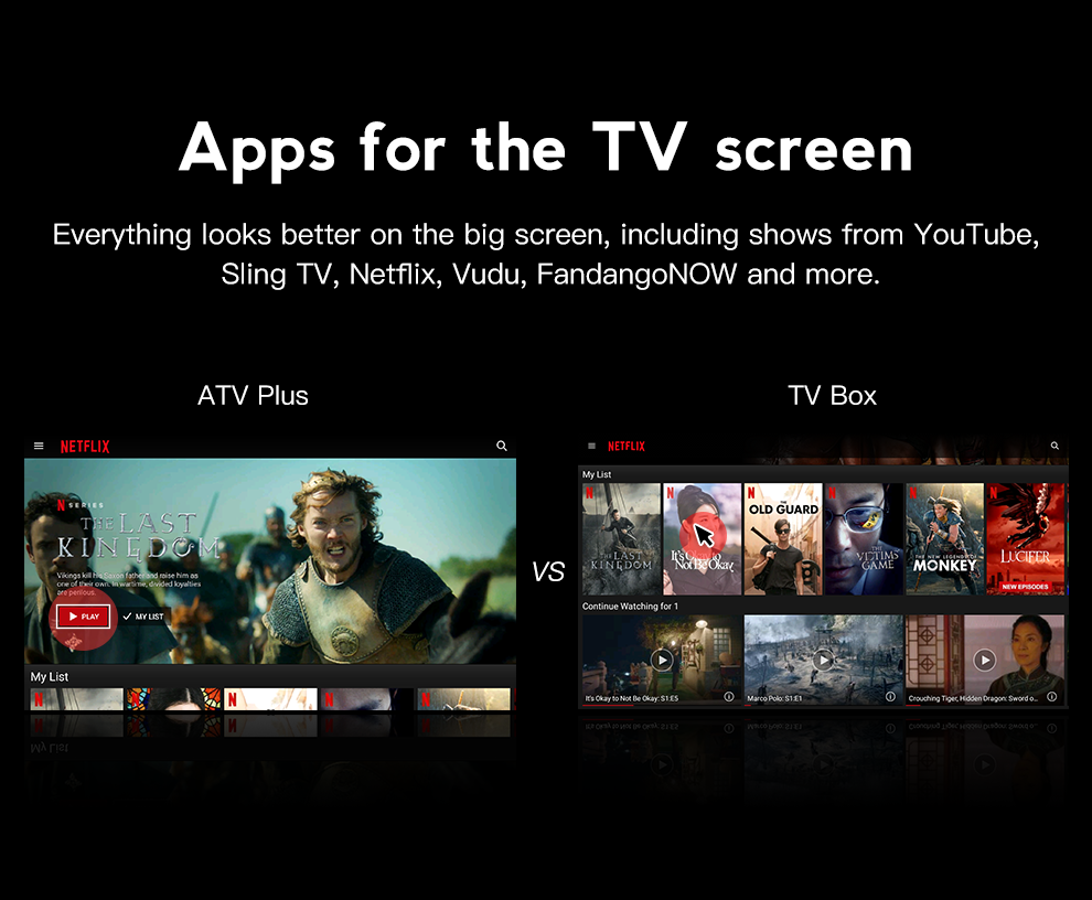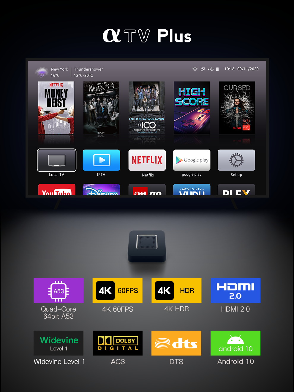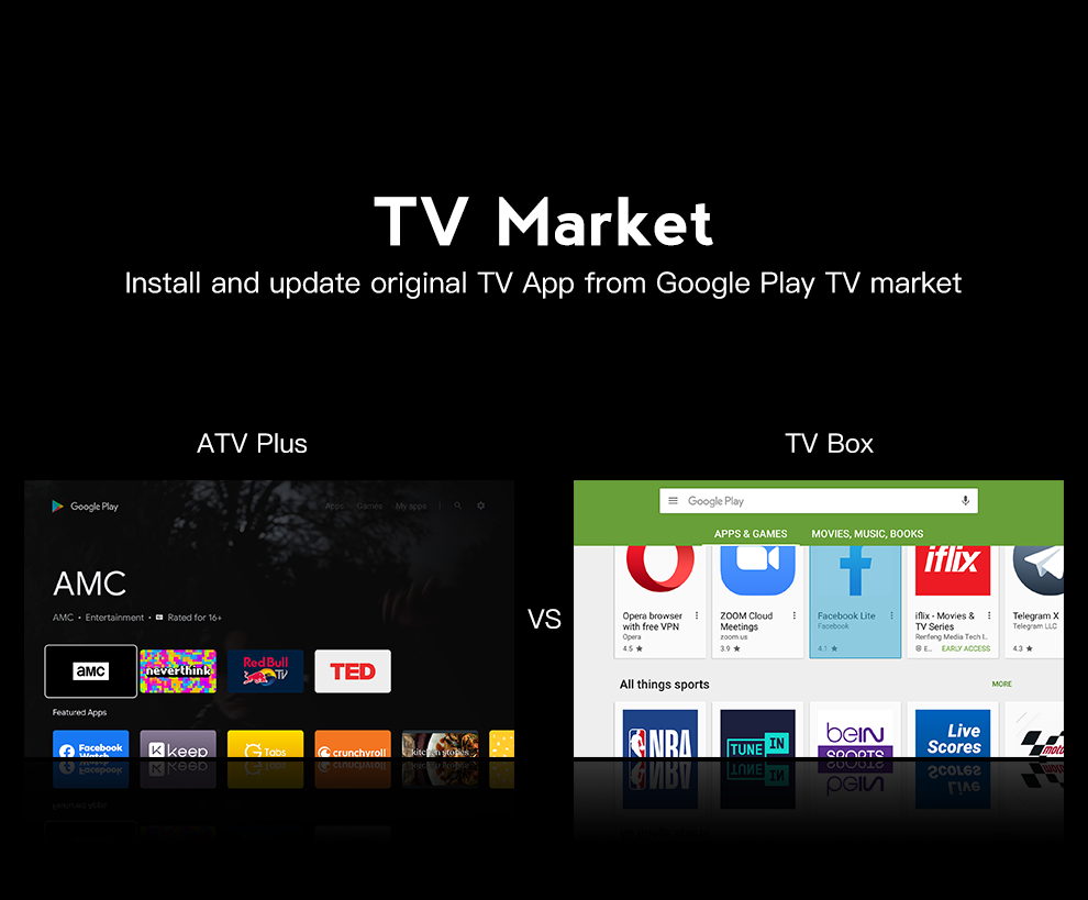 | TV APP | Google Play, Netflix(1080P), YouTube(4K), KODI(XBMC), Plex etc. | |